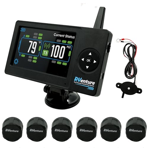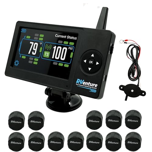 - RV TIRE PRESSURE MONITORING SYSTEM – Featuring a vibrant 5-inch widescreen color display, shows real-time pressure and temperature readings with clarity. It offers visual, audible, and text-based alerts to notify you of unsafe conditions.